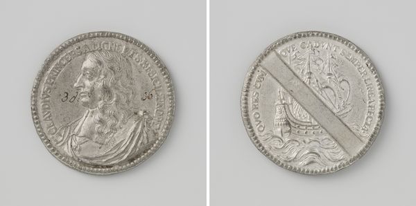 Editor: This fascinating piece, entitled "Inauguration of the Duke of Anjou as Duke of Brabant," is dated 1582 and was created by P. Basseliers using print and metal engraving techniques. I'm struck by the craftsmanship of this tiny, dual-sided metal object; you can even see the individual lines and labor of each tiny cut made to each side! What stands out to you about it? Curator: For me, the immediate point of interest lies in the piece's material reality as a form of currency and social exchange. Think about the laborious processes required: the mining, smelting, engraving, and striking. Each step involved human labor and the transformation of raw materials into a symbol of power. How does understanding the coin's function affect your interpretation of the Duke’s portrait? Editor: Well, knowing it's currency, it becomes much more apparent that the image functions as propaganda. It’s designed to be handled, traded, and seen, thereby legitimizing his power through everyday exchange. But does its scale—being such a small object—affect how successful it can be at propagating these ideologies? Curator: Absolutely! The coin's intimate scale requires close examination, suggesting a personalized form of engagement with power. The labor of creating these coins was definitely intensive. The small format doesn’t diminish its impact. In fact, the deliberate distribution of such material reinforces a social order with every transaction. What does that tell you? Editor: It tells me that it acted almost like an early form of mass media! Something designed to spread an idea, and to also facilitate the actual material business of the state. I never considered something like currency could carry such heavy symbolic weight. Curator: Precisely. We must constantly analyze how materials and methods intersect with power and ideology. Understanding the material conditions of art making—and here the industrial effort behind the metal and engraving process—offers critical insights into its broader social function.