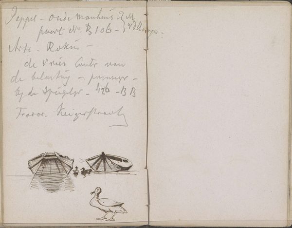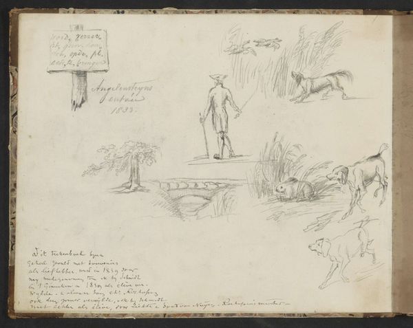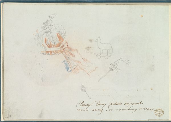 Curator: The piece before us is titled "Roundel with Bird in a Landscape and Small Sketches," made between 1785 and 1790 by an anonymous artist. It's a mixed-media work using watercolor, ink, and colored pencil on paper. Editor: My immediate impression is of delicacy, like a captured, fleeting thought. The circular frame contains this bird perched amidst a hazy landscape, almost dreamlike in its softness. Curator: Precisely. The composition utilizes a roundel to frame a pastoral scene, inviting a deeper consideration of form and structure. Note the balanced arrangement of the bird on its perch against the vague architectural structure, suggesting a carefully constructed pictorial space. The semiotic interplay of line and color creates a structured visual hierarchy. Editor: And what about the physical making? Look at how the watercolour bleeds softly, how the ink anchors the spontaneous scribbles alongside the roundel. These additions disrupt any formal reading. They suggest that this may have been something created by hand that's more about craft and creation of artwork as labour itself. Curator: While the annotations disrupt the purity of the landscape, I see them as integral, adding another layer to the work’s structural complexity. They create a deliberate contrast with the pictorial image, creating dissonance, a play of literary and pictorial signs. Editor: Yes, but those annotations—poems or journal entries, perhaps—hint at the lived experience behind this little scene. A domestic space with personal annotations and miniature artworks such as this likely reveal aspects related primarily from inside family units during the end of the 18th Century that many works from the 18th century generally suppress because the materials aren’t worthy to their subjects, let alone for high-class art audiences. Curator: An insightful observation! However, it would be a reductive dismissal. What seems informal might yet adhere to certain aesthetic precepts which deserve investigation. Editor: Perhaps both our perspectives hold truths. A study in contrasts and subtle connections. Curator: Indeed. An intersection of structured form and free expression.