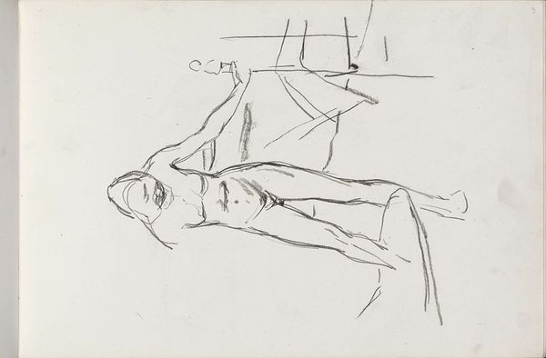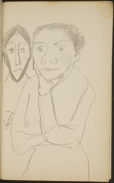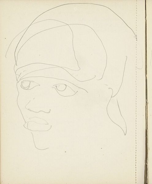 Curator: Here we have a pencil drawing by Max Beckmann, "Figur mit Hut," or "Figure with Hat," taken from page 25 of one of his sketchbooks. Editor: My first impression is one of anonymity and hidden identity. The heavy shading over the eyes gives this figure an air of mystery, almost like a character in a film noir. Curator: Exactly. Beckmann was deeply affected by his experiences in World War I, and his subsequent work often reflected a sense of societal unease and the loss of innocence. The use of simple materials like pencil and paper allowed for a direct, unfiltered response to his environment. These drawings, born out of trauma, carry the burden of war's disfiguring effects. Editor: I see the war trauma reflected, but perhaps also a more universal statement on the masks we wear – especially poignant during a period of profound social upheaval. I wonder what Beckmann aimed to conceal or reveal about the sitter. The heavy brow could speak to the weighty responsibility he faced as an artist during political distress. Curator: The sketchbook format also provides insight into his artistic process. This wasn't a finished piece meant for immediate public consumption, but rather a private exploration of form and emotion, almost like a visual diary. The figure is caught in the throes of introspection, revealing his response to both aesthetic questions and life. Editor: Considering the period, you might even view this figure through a lens of marginalized identity. Given the war's climate of extreme nationalism, the obscuring hat creates a barrier, possibly shielding the figure from societal judgment or worse, persecution. Curator: It certainly allows for multiple interpretations, reminding us of the complex layers inherent in Expressionist portraiture and its capacity for challenging normative constructs. Thank you for lending that vital political perspective to the discussion. Editor: Absolutely. Looking at this artwork with you, I realize just how a simple medium like pencil, in the hands of an artist like Beckmann, can speak volumes about societal structures and the vulnerable figures caught within them.