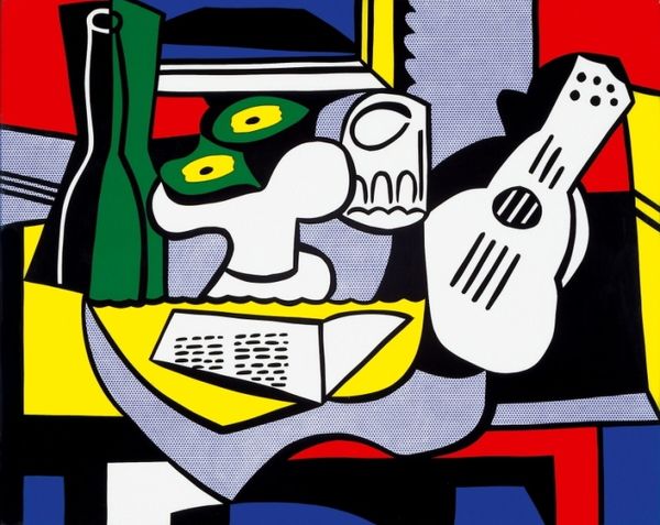 Roy Lichtenstein made this painting, Cubist Still Life, as a kind of copy or re-make of Cubism, but in his Pop Art style. He took this very high art, European painting movement and made it into something flat, graphic, and well, a bit trashy? The texture here is all in the surfaces he depicts. Look at the fake wood grain. And he uses those signature Ben-Day dots, originally used for comic book printing. It’s like he's saying: artmaking is a process that’s also a kind of industrialized image-making. I’m struck by how graphic this painting is. I mean, this is paint, but it looks like a print. Lichtenstein really flattened the image, and the original Cubists were already flattening things quite a bit! What does it mean when an image gets flattened again and again? What are we left with? It's like this piece is saying that art is an ongoing conversation with the past.