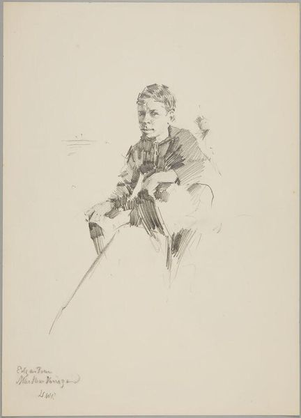 Curator: Here we have "Sketch of a Boy" by William Valentine Schevill, a small pencil work on paper in the Harvard Art Museums collection. It measures about 16 by 14 centimeters. Editor: Oh, he looks…troubled? The hatching is so dense around his head, like dark thoughts swirling. Curator: The quick, economical lines suggest a study, perhaps for a larger composition. Note the details on his jacket: the buttons, the lapel. These suggest social status, maybe even future prospects. Editor: I see him as trapped. All that scribbled shadow feels oppressive, and he's clutching something… a letter? A burden? Curator: It's intriguing how Schevill uses the very act of sketching, the building up of line upon line, to construct not just an image, but a mood, a social context. Editor: Right! It's more than just a likeness, it’s a little story scratched onto paper. Makes you wonder what happened to the boy. Curator: Yes, it highlights the narrative potential inherent in even the simplest of artistic processes. Editor: It does. And it makes me want to find out.