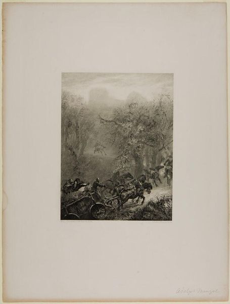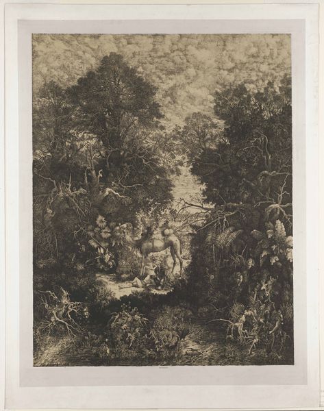Editor: So, this is Rodolphe Bresdin’s “The Cities Beyond the Marsh,” an etching from 1868. It's incredibly detailed and kind of overwhelming, almost gothic in its mood. What do you see in this incredibly dense landscape? Curator: Immediately, I'm drawn to the light and shadow – the dramatic chiaroscuro. The path winding through the dense foliage... it almost feels like a visual metaphor, a journey through the subconscious. Do you see the small figures amidst the vegetation? Editor: Vaguely, yes. They’re easy to miss, almost consumed by the surroundings. Curator: Exactly. Consider the Romantic era in which Bresdin worked. These landscapes often symbolized the power of nature, but also humanity's insignificance. Those tiny figures become allegorical. Could this be the journey of the soul, with obstacles and hidden dangers represented by the marsh and forest? And the cities in the distance, a longed-for spiritual haven? Editor: That makes sense, given the title. So, you're seeing the landscape not just as a place, but as a symbolic representation of an inner journey. I didn't initially connect the title so directly, thinking more of a fictional or fantasy space. Curator: Indeed. The symbols invite reflection. Bresdin’s technique is extraordinary, too. See how the density of lines creates texture, depth? Think about the emotional weight given to certain persistent symbolic images over time, such as a mountain representing the human spirit's need to be challenged and to ascend. Editor: It's almost like he's not just depicting a scene, but also evoking a feeling, or maybe a memory? It definitely encourages slow, careful viewing. Curator: Precisely. I leave this piece seeing nature as both an objective location and a powerful metaphor, revealing the artist's and our interiority. Editor: I'll never see a landscape the same way.