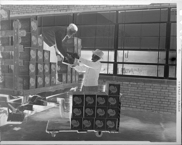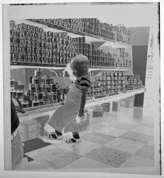 Editor: This is an untitled photograph by Jack Gould depicting a child in a grocery store, seemingly mesmerized by boxes of soap. It's a simple black and white image, but the composition is really striking. What's your take on its historical context? Curator: Well, the image captures the post-war consumer boom. Notice the brands: Brillo, Lux, Vel. They weren't just products; they were symbols of modern domesticity aggressively marketed. The child's fascination highlights how consumer culture was shaping even the youngest minds. How does that strike you? Editor: I guess it's easy to overlook the power of everyday objects. It makes you wonder about the values being instilled. Thanks for pointing that out!