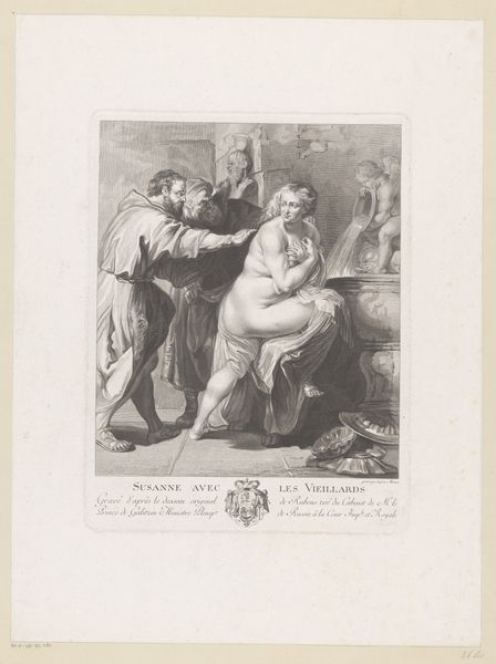 Jacques Louis Copia created this engraving titled "Milord Edouard en Saint-Preux" sometime in the late 18th century. The somber atmosphere is constructed through the use of monochrome tones and detailed line work. Copia uses the formal elements to explore power dynamics, notice the clustering of figures around the kneeling man; the lines of their bodies create a sense of enclosure. The standing figure on the right asserts dominance, his posture and position physically imposing over the figure kneeling before him. This calculated arrangement uses spatial relationships to depict social hierarchy and emotional tension. The semiotic implications here go beyond a simple narrative, engaging with broader cultural discourses around class, morality, and representation during the Enlightenment. The composition and the contrast between light and shadow serve to create a powerful visual commentary on the complexities of human relationships and social structures.