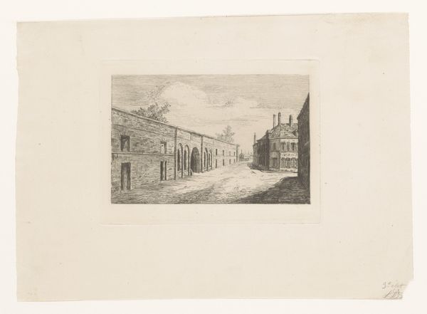 This etching, "Gezicht op Heeg," was created by Carel Frederik Bendorp around the late 18th century and is held in the Rijksmuseum. The composition immediately draws you into a world meticulously rendered with fine lines. The buildings recede into the distance, establishing a strong sense of depth. Consider how Bendorp uses line and perspective to convey not just a place, but also a social structure. The buildings, identical in form, emphasize the repetitive rhythm of daily life. Yet, they also suggest a certain order, a codified way of living. This structured portrayal could reflect the Enlightenment's emphasis on reason. Observe the balance between light and shadow, where the play of light emphasizes texture and form. The linear precision isn't merely descriptive. It's a deliberate attempt to capture an ideal, projecting a sense of order onto the scene. Bendorp invites us not only to observe but to decode.