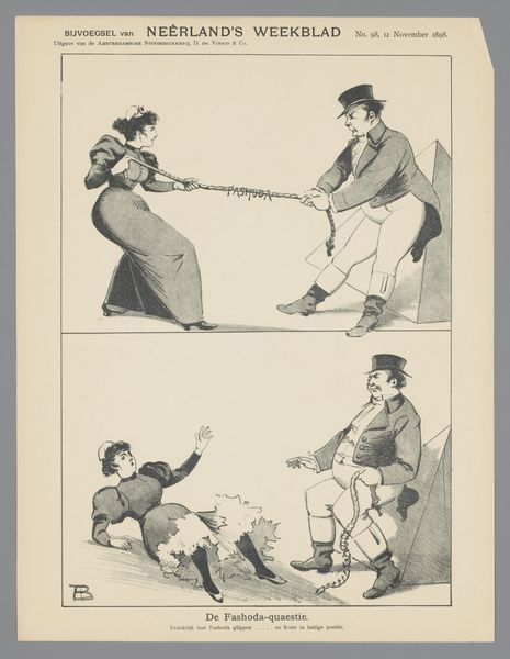 This print, made by Nicolaas Johannes Wilhelmus de Roode, commemorates 50 years of Dutch independence in 1863. It's a lithograph, a printing process that allows for detailed, almost drawing-like qualities. Lithography relies on the contrast between greasy and water-receptive areas on a flat stone or metal plate. The image is drawn with a greasy crayon, then the surface is wetted; ink adheres only to the drawn areas. This print would have required a skilled hand, both to create the image and to execute the printing, pulling each impression with care. The material— humble ink on paper—belies the complexity of the political message at play. The artist has depicted "The unity of the anti-liberals in the Second Chamber!" with three figures forming a tower, toppling another man to the ground. It is precisely through the print medium that this kind of political commentary could reach a wide audience, engaging viewers in the social and political issues of the time. The lithograph served as a powerful tool for disseminating ideas, blurring the lines between art, craft, and political discourse.