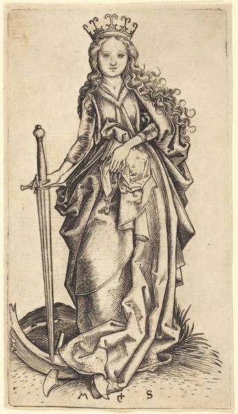 Editor: Here we have Clemens Aloys Hohwiesner's "Saint Christopher" from 1803, a print using ink on paper. It's a powerful image. Christopher looms large, burdened yet resolute. What kind of symbolism jumps out at you here? Curator: Immediately, I'm drawn to the duality: the figure’s evident strength juxtaposed with the child perched on his shoulders. Notice how Christ, as a child, carries the orb—the weight of the world made manifest. The artist reminds us that true strength often lies not in brute force, but in service and acceptance of burden. The landscape in the background echoes this. What stories do you imagine lie within it? Editor: The landscape feels like a memory, hazy and distant. I suppose it grounds the figure in a specific time, adding a historical element. Why depict Christopher so often carrying a child? Curator: Saint Christopher's story evolved over centuries, shifting from a fearsome, dog-headed giant to the gentle protector we see here. The image resonates because it embodies the journey, the transformation from raw power to compassionate strength. He bears the weight of innocence and divine potential. Does this interpretation affect how you perceive the artwork’s mood? Editor: Definitely. I initially saw it as just a powerful figure, but understanding the context, I now perceive humility and purpose. The artist really packed so many meanings into one picture. Curator: Indeed. Hohwiesner uses the engraving to weave together layers of cultural memory and spiritual meaning, reminding us that images hold the power to transform belief across generations. Editor: I'll certainly look at similar pieces in a new way from now on. Thanks for opening my eyes!