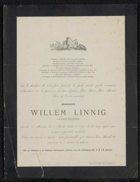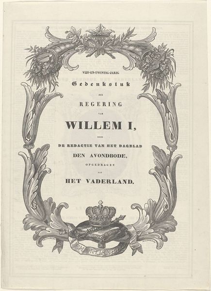 This commemorative print, created by A. Entrop van Poeteren in 1848, is made of paper, and printed using letterpress and lithography. Notice how the texture of the paper provides a subtle yet crucial backdrop for the bold typography and decorative elements. These techniques allow for the relatively quick reproduction of images and texts, essential for spreading political messages to a wide audience. The crisp lines and distinct lettering demonstrate the precision of the printing process, which was becoming increasingly industrialized at this time. Consider the social context: this print honors Willem I, Prince of Orange, a figure associated with Dutch nationhood. The technology used to produce this print reflects the changing landscape of production in the 19th century, mirroring shifts in labor and consumption. The print is not just an image; it is a material document that embodies the spirit of a transformative era. By paying attention to materials, making, and context, we can better understand the complex relationship between fine art, craft, and the wider world.