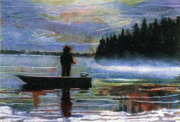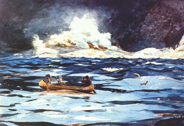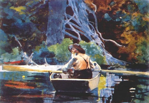 Curator: Winslow Homer’s 1897 watercolor, “Canoe in the Rapids,” presents a strikingly dynamic scene. What are your initial impressions? Editor: There's a certain urgency to this work; the turbulent water and stormy sky definitely convey a feeling of risk. The light on the water is incredible and suggests something symbolic might be at play, despite its somber feeling. Curator: The symbolism is interesting because while it can stand as a snapshot of late 19th-century wilderness adventure and recreation, we might also interpret it through the lens of masculinity and the era's conceptions of manifest destiny and the challenges of the unknown. There's also the tension of representing leisure within a complex sociopolitical backdrop, especially considering class and racial dynamics. Editor: Precisely. Water is almost always a loaded symbol. It evokes so many fundamental associations; it can be both life-giving and destructive. The canoe itself becomes a fragile vessel battling against a greater, perhaps indifferent, force. Even the clothing choices of the two passengers speak volumes—they’re wearing distinct garb which can also lead the viewer down symbolic trails of understanding the cultural memory of what they're doing in that moment of the painting and beyond. Curator: The composition also demands scrutiny, framing these figures not just as individuals experiencing nature but also as part of a larger narrative—are they pioneers, escaping, or just simply passing through? This speaks to deeper questions of access and privilege within a landscape loaded with historical weight. The lack of visual cues of control as the canoe disappears between towering swells makes the power dynamics complex, and makes it tough to know if anyone or anything is in control. Editor: And note how Homer depicts the rapids themselves; these roiling forms echo primordial chaos, an ever-present, timeless challenge. Water here seems to be the literal and figurative undercurrent, shaping not only the landscape, but the symbolic understanding as well. It's also a classic representation of romanticism and it’s cultural roots, which I love. Curator: It’s a masterful interweaving of aesthetic beauty with layered societal commentary. Winslow's mastery encourages viewers to look beyond the immediate and examine the rich, often conflicting implications within this scene. Editor: Indeed. And with so much depth packed into something so outwardly simple. Winslow makes great choices.