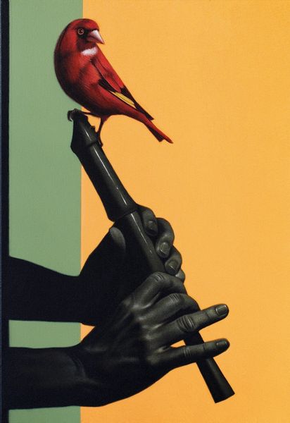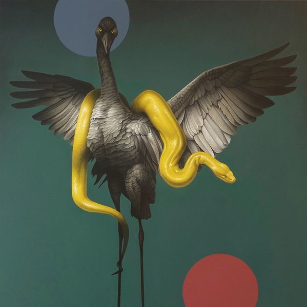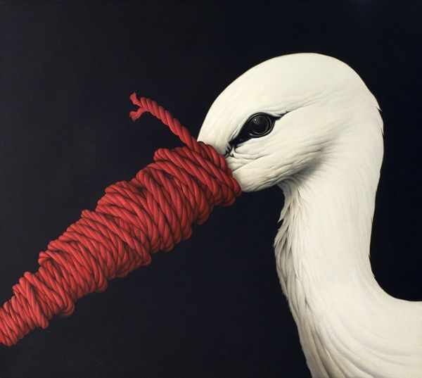 Eckart Hahn created "Us of One" as an unreal diptych of surrealist-naturalism. The composition is dominated by two flamingo-like figures whose necks are entwined in a knot, rendered in startling hues of red and black. The texture is smooth, with the roped legs contrasting the soft feathers. This work destabilizes our understanding of form and function. The birds' bodies merge and diverge, creating a tension between unity and separation. The contrast between the vibrant red and somber black could be read through a semiotic lens, as a clash between vitality and mortality, love and grief. The birds are bound together by the knot, a symbol of commitment, but the knot is also an obstruction, a painful restriction. The formal qualities of "Us of One" serve as more than just aesthetic choices; they function within a larger discourse about relationships. Hahn invites us to interpret and reinterpret, challenging fixed notions and exploring the fluid, often contradictory nature of connection.