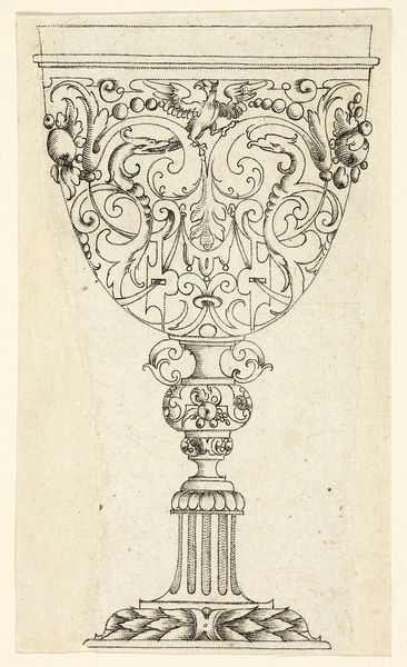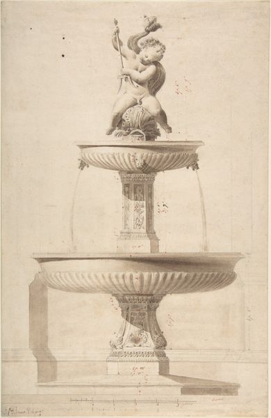 Jean Charles Delafosse made this design for a ewer in pen and brown ink with gray wash in France. The drawing gives us a glimpse into the world of eighteenth-century decorative arts and the ways that design was institutionalized. Delafosse was a designer, a printmaker, and an architect who taught at the Académie Royale d'Architecture. He produced many suites of engravings that served as models for artists and artisans. The drawing’s classical motifs are typical of the period; winged mythological figures surround the vessel as if it were an ancient monument. It reflects a moment when the French monarchy and its institutions were seeking to cement its power by looking back to the grandeur and authority of the Roman Empire. This drawing can be better understood through archival research on the history of the Académie Royale d'Architecture and its role in shaping French artistic taste.