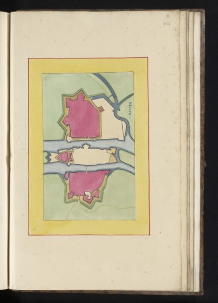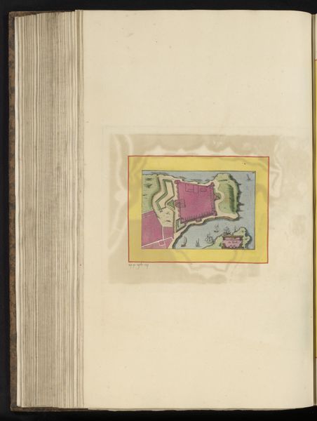 Curator: Looking at this piece, I immediately get a feeling of strategic tension. It’s fascinating how cartography can convey so much more than just location. Editor: Absolutely. Let’s dive into it. What we have here is an anonymous 17th-century drawing, “Plattegrond van de ligging van het kasteel van Pont-de-l'Arche ten opzicht van de stad,” or, "Plan of the location of the castle of Pont-de-l'Arche in relation to the city," created around 1657 using watercolor and colored pencil on paper. It’s a bird’s-eye view. Curator: That castle practically leaps off the page! Note how the artist uses vibrant hues to delineate the castle walls from the surrounding land. What might that signify? I wonder how color helps us understand which part of the city was deemed significant? Editor: Good question. Pont-de-l'Arche held substantial political sway during this period, and, thus, was highly strategic. I imagine that maps like this helped leaders visualize their defenses and how power was structured across the territory. Consider how city planning and cartography played a significant role in expressing authority at that time. Curator: Indeed. Symbols are vital in conveying a worldview. Water is the calm, connecting agent. But what's truly fascinating is that symbolic relationship between the physical land, as represented through the river, and strategic structures – I imagine that river represents not just transport and logistics but perhaps the lifeblood of the city itself? The city quite literally orbits it. Editor: I think you’re right about the lifeblood metaphor. But more pragmatically, notice where the artist’s compass rose points. Given the lack of roads in that period, one could assume the rose, and the text at the bottom, probably help contextualize what can and cannot be reached. Curator: What really gets my attention is the tension. I notice an imbalance. I would read into that imbalance a potential for weakness – or even conflict! I bet there's something hidden here about this power dynamic – a castle, a bridge: the image seems loaded with social and psychological undercurrents that ripple out across this community. Editor: These maps help us grasp the tangible infrastructure that structured governance at the time, illustrating not just the physical landscape, but the mechanisms of social and political life in the 17th century. This artwork illustrates our modern challenge: what is lost as technology flattens symbolic tension and expression? Curator: This isn't just a map. This drawing gives us a glimpse into the heart of a city, revealing both its external defenses and inner character. Thank you.