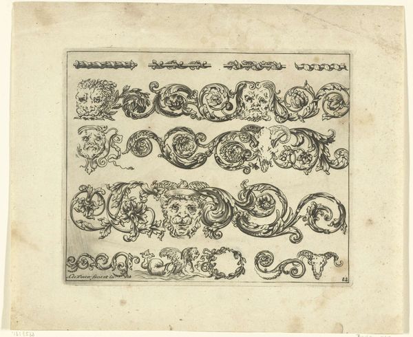 Curator: Here we have Daniel de Lafeuille’s “Vijftien lettermonogrammen (MNR-NOV),” dating back to around 1690-1691. It's a pen and ink drawing on paper. What's your immediate reaction to it? Editor: Whoa, it’s intricate! Like a page out of someone's secret spell book, or maybe a funky sampler. The overlapping lines create a hypnotizing maze. It is beautiful chaos. Curator: Precisely. Look at the repetition of form, a series of complex monograms. These aren't mere doodles. They were likely studies or designs for decorative initials, perhaps for bookplates or heraldry. Consider the social context: in the late 17th century, elaborate monograms signified status, literacy, and access to artisanal production. Editor: Artisanry…that’s key, right? You can almost feel the steady hand guiding the pen, repeating and refining the shapes. The commitment to that detail…it gives off serious meditative vibes. Also, are they all Ms? They're teasing my pattern recognition skills. Curator: Predominantly, yes, although the letters vary with each monogram. It represents a dedication to the craft and a commission market, it represents the demand for refined artisanal skills during that period. And how each monogram is uniquely constructed shows a deep understanding of lettering and design principles. It’s about material expression as status. Editor: That's a super interesting idea. But what stands out most to me is the artistic license the craftsman enjoyed. Like he or she could imbue each little glyph with unique, tiny explosions of their artistry. Curator: And of course, remember the means of production. This wasn't mass produced. Each monogram represents a discrete investment of time and skill. That exclusivity further enhanced the work's value within its social setting. Editor: True! Seeing it through that economic lens adds so much depth, almost changes its atmosphere entirely. Suddenly it's not just pretty—it's precious. Curator: Well, precisely. These pieces shed light on the social and economic structures of their time and the lives involved. Editor: Indeed. The blend of labor, art and society... a surprisingly modern feel despite the antiquity. A dizzying glimpse of craft, economy, and a good shot of elegant self-expression.