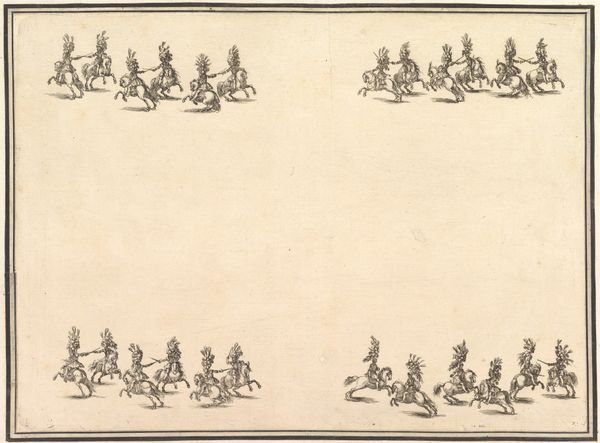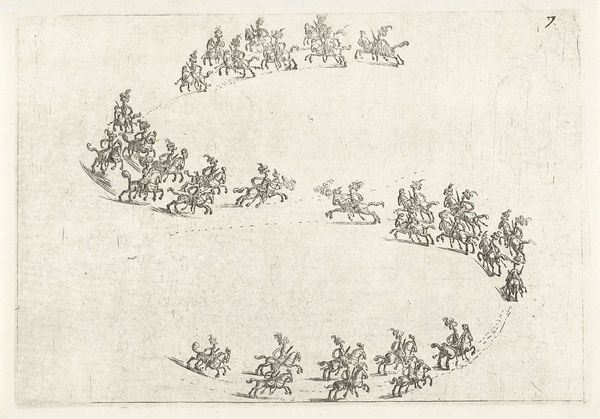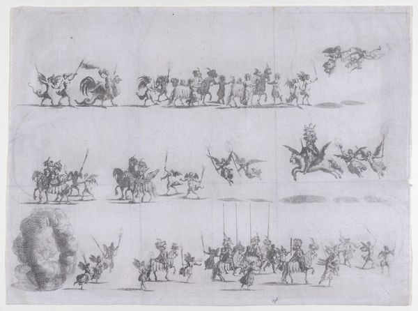Editor: This is a print from 1694 by Adriaen Schoonebeek called *Zeegevecht tussen Hollanders en Fransen op de Noordzee (plaat 5)*, housed at the Rijksmuseum. It depicts a naval battle between the Dutch and the French, rendered in a rather stylized way. What really catches my eye is that little cherubic face in the top left corner who seems to be summoning the winds. How do you read an image like this? Curator: Ah, yes, a charmingly baroque depiction of maritime conflict. Note how the artist blends the real with the allegorical—the precise arrangement of the ships with the god of wind at the upper corner! To me, it speaks volumes about the Dutch Republic's self-image at the time. What do you notice about the way the ships are organized and labeled? Editor: Well, there’s a key at the bottom that identifies different commanders and ships with letters and numbers which feel rather precise and… well, organized for something so chaotic. It seems as though a hierarchy is depicted; would this reflect the strict naval system in the 17th century? Curator: Precisely. But look closer. Beyond just documenting the order of battle, it's almost a dance, wouldn't you say? A carefully choreographed performance of power. Also, consider this: engravings like this were relatively inexpensive and reproducible. Who do you think the primary audience was? Editor: Probably not the admirals! More likely a wider public, eager for news and perhaps a little patriotic boost. Curator: Exactly! These prints were not just historical records, but carefully constructed pieces of propaganda, intended to shape public opinion. Did you notice the cityscapes visible near the horizon line? Editor: Yes, this level of detail suggests it could also be read as a proud document celebrating the defense of the Republic, seen on the horizon. It is compelling how such seemingly objective records contain such clear biases! Curator: Indeed. Looking closer helps us decode both the explicit narrative and the subtle messages embedded within. There's always more than meets the eye with prints like this, don't you think?