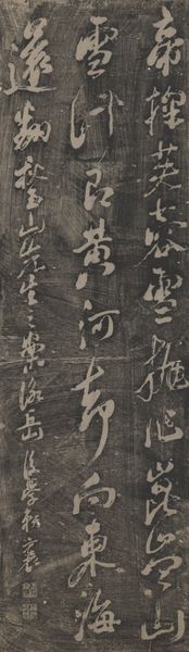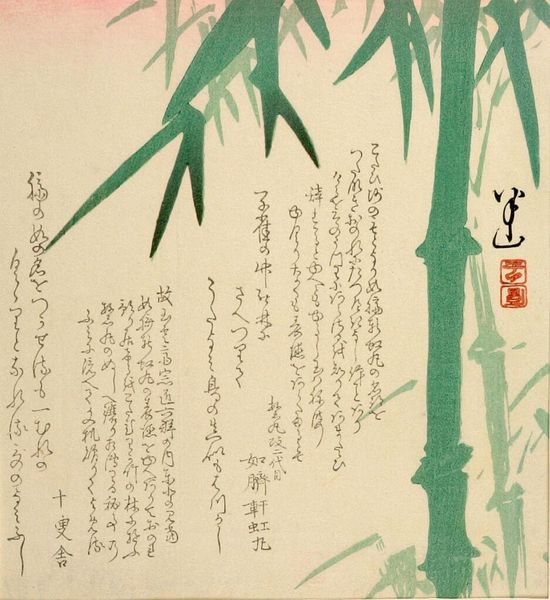 Curator: Here we have Kinoshita Itsuun's "Bamboo in Wind and Rain," created sometime before his death in 1866. Editor: Oh, the way the bamboo leans—it's like a fleeting dance, a struggle against an invisible force. I find that so poignant. Curator: Bamboo often symbolizes resilience, strength, and flexibility in the face of adversity in East Asian art. Editor: Yes, exactly! It's not just surviving but bending, adapting. The strokes are so expressive; you can almost hear the wind. It evokes a sense of vulnerability. Curator: The cultural memory of bamboo also carries a connotation of moral uprightness. This work reveals a continuity between nature and ethical ideals. Editor: It does, doesn't it? I'm struck by how a simple plant can whisper so many stories. Curator: The brushwork here demonstrates the artist's mastery of ink. Editor: It makes me think that there's so much contained in empty spaces. Curator: Indeed. Thank you for pointing out these profound connections. Editor: My pleasure.