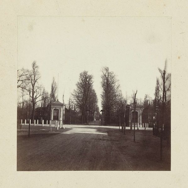 Curator: There's an undeniably somber mood about this piece. Editor: Yes, "Laan in het Vondelpark, Amsterdam," taken anonymously sometime between 1868 and 1890, presents an image that initially appears simple, but invites reflection on urbanization and public spaces. The location depicted here is not just any park lane, but a constructed landscape. Curator: That's so fascinating. The rows of bare trees lining the path, all identical, almost evoke the disciplined ranks of soldiers or perhaps societal structures themselves. Trees as symbols of natural strength made subservient to planning. I wonder what that was meant to symbolize? Editor: Precisely. I think it represents how nature, in this period, was viewed and literally shaped to serve societal needs. Note the road; its starkness divides the park, emphasizing movement and control. Consider the limited access for various demographics too; parks often served specific social strata. Curator: It does give off a melancholy feeling in its pictorialist tones, perhaps the symbolism that humans have separated themselves so completely from nature itself in pursuit of civilization. And you are absolutely right, those tones serve a historical reminder of its complex implications! Editor: This intersection between realism and the rise of pictorialism is especially important. It shows a staged reality which, in its construction, reveals social aspirations. Curator: And also reveals the potential erasures embedded within notions of progress—what got lost to make way for that road? Thank you, your lens helps clarify this tension, prompting deeper thinking about these representations. Editor: Similarly, reflecting on how even seemingly innocuous landscape prints are, in essence, sociopolitical constructs—that's my enduring takeaway from pieces like this. Curator: Exactly. Thank you. It’s always intriguing how art speaks volumes about hidden and complex messages through the symbolism of public life.