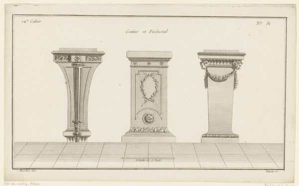 Curator: This engraving, titled "Twee haardschermen," offers a glimpse into 18th-century decorative arts. Created between 1772 and 1779 by Nicolas Dupin, it presents two designs for fire screens in elegant detail, and is held today in the collection of the Rijksmuseum. Editor: The stark linearity is the first thing I notice. The mood is very cool and formal, almost sterile, despite the decorative nature of the objects represented. It's a technical drawing as much as it is a design. Curator: Precisely. The work belongs to the Neoclassical movement, reflecting the era's fascination with classical form and order. Dupin's fire screens can be seen as objects of bourgeois aspiration, speaking volumes about social status and domestic life during the period. They are essentially signifiers of wealth in the home. Editor: How fascinating to consider the fire screen itself, and fire generally, as a locus for social interaction and gender roles! While men conduct the economic 'fire' of the household outside, women preside over the actual hearth. And it also reminds me of contemporary dialogues around sustainability. Consider how the reliance on excessive burning fuels not only warmth, but global inequities. Curator: I see how you are connecting energy politics to this historical object, even within the decorative arts and societal expectations embedded within it. The screens are very much an outcome of social conventions. The formal compositions echo a societal need for structure and controlled imagery, which we might link to broader power dynamics of the era. The design and display would have signaled very specific notions of taste, status and perhaps even gender performance. Editor: Considering their size and material delicacy, one questions how effectively the screens would have performed their primary function. They might then serve foremost as representations—cultural indicators more than useful instruments. Curator: Indeed, this analysis reveals not just aesthetic tastes but also how social meaning and function intertwine within these objects. Thanks for pointing that out! Editor: Thank you, understanding these fire screens more comprehensively gives a unique view to a time of societal change!