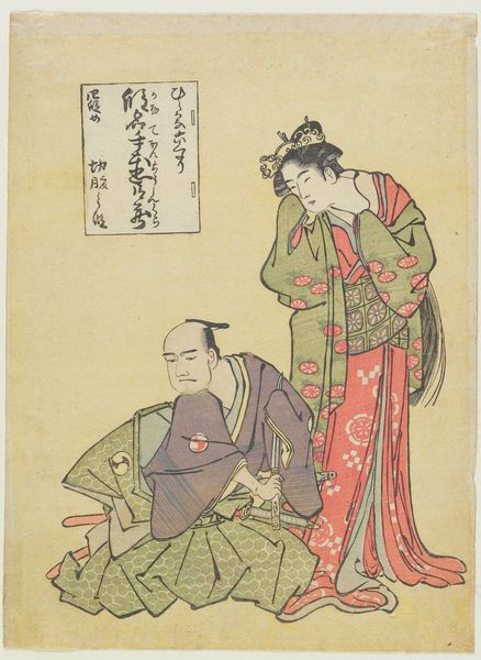 Curator: Well, it's quite intriguing how Shunkō managed to portray three distinct roles within a single woodblock print. This piece, titled "The Fourth Iwai Hanshiro in three roles of the shosa 'Shichi Henge'," created around 1787, gives us insight into the celebrity culture surrounding Kabuki actors of that time. Editor: Immediately, I'm struck by the artist's masterful use of line. Look at how simple, almost minimalist, the strokes are, yet they define the shapes and convey emotion so effectively. Curator: Absolutely. Woodblock prints like this weren't just art; they were also popular media, effectively capturing and distributing images of the leading performers of the day to a broad audience. Shunkō's work participated in this public fascination. Editor: And consider the composition! The three figures, layered, yet each visually distinct. The patterns in the kimonos – so detailed, a vibrant interplay of geometry and floral motifs – it prevents any flattening of the overall picture plane. Curator: Indeed. This print immortalized Iwai Hanshirō, celebrating the actor’s skill in 'Shichi Henge,' where a single performer embodies multiple roles in quick succession. This was entertainment but it also reflected societal fascination with transformation and skill. Editor: The coloring seems very restrained though, wouldn't you say? Predominantly pastel, giving a somewhat dreamlike and subdued quality. And it creates a gentle tonal harmony within the angular composition. Curator: Restrained maybe to our modern eye, but consider the context. These prints were often mass-produced. The colour choices were strategic, balancing artistic intent with practicality. They had to be economical with colour, relying more on precision. Editor: Still, it feels deeply aesthetic. Even the negative space enhances the forms. There is such refinement in how Shunkō created three characters on one plane. Curator: Reflecting upon Shunkō's work, it is exciting to realize this isn’t just a static image, it's a piece of social commentary, offering a snapshot of entertainment culture and societal values from centuries ago. Editor: Yes. And for me, thinking about its enduring visual allure makes me think this: regardless of the cultural context, we’re responding to a masterclass in pictorial structure.