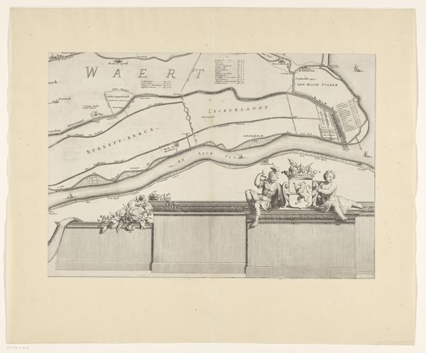 Curator: This intricate etching, crafted after 1666 by Joost van Geel, is titled "Kaart van de Maasmonding met postroutes," depicting a map of the Maas estuary alongside postal routes. It's fascinating to consider the labor and logistics embedded within this seemingly simple document. Editor: It’s striking. The lines, so fine and deliberate, render a world in miniature. I’m drawn to the geometric precision juxtaposed with the lively ships scattered across the waterway. Curator: Precisely. Van Geel worked within a complex system of patronage and printmaking. Each ship, each carefully rendered line, speaks to the social need for trade and communication, underpinned by the skilled labour of craftsmen. Notice how the depiction of postal routes highlights the Dutch Republic's advanced infrastructure and mercantile ambitions. Editor: The contrast between the structured map and those cherubic figures holding the title plaque is visually arresting. What purpose do you think they served, stylistically or otherwise? Their positioning reminds me of Baroque embellishments within a predominantly practical framework. Curator: Well, I find their presence illustrative of a tension, revealing how the art world often overlays craft with ornament. Here, putti elevate functional cartography into something worthy of artistic admiration. They signify the labor and economic systems the map embodies and their transformation into something of high value. Editor: Perhaps. To my eye, it's about balance. They seem to serve more to elevate the aesthetic of the etching itself, transforming it from mere document to an art object worthy of contemplation. The material conditions of production are apparent, but so is the artistry and intention behind the rendering. Curator: A keen insight. But without understanding the print's role within 17th-century Dutch society – the skilled labor, the systems of postal networks, the commercial imperative – do we really grasp its full significance? Its aesthetic design also obscures power structures inherent within its production. Editor: Point taken, of course the social context informs and enriches our experience. However, isolating the art object and considering how elements such as scale and precision generate meaning should also be central to understanding the work. Thank you, I am changed. Curator: I'm glad that you enjoyed it; I see our appreciation of the etching’s visual design allows us to remember the tangible processes that define art.