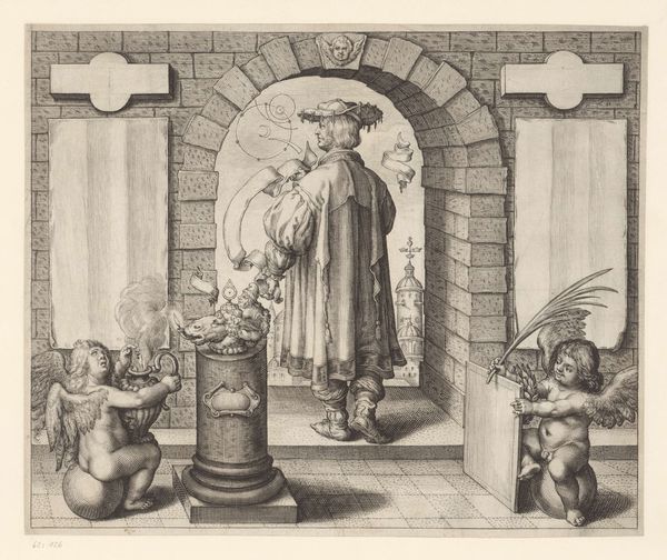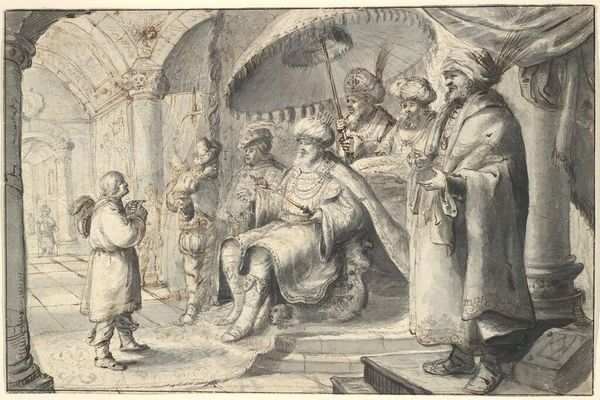 Editor: This drawing, "Genre Scene with a Man, a Woman and a Cat" by Gerbrand van den Eeckhout, captures a seemingly ordinary moment. I'm curious about the apparent tension between the figures. What do you see in this piece? Curator: It's fascinating to consider how seemingly mundane scenes like this can reveal so much about the social power dynamics of the 17th century. What do you notice about the figures' body language and their positioning within the space? Editor: The woman seems to be recoiling slightly. Is it possible that this artwork is commenting on the domestic roles and gender expectations of the time? Curator: Precisely. Eeckhout, consciously or unconsciously, offers a glimpse into the negotiations of power within a domestic sphere. The cat too, could symbolize the contested space. Reflecting on this, it seems every element carries a weight, doesn't it? Editor: It does. I now see how much this work reveals, beyond just a simple scene.