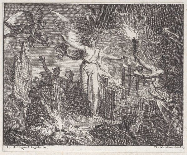 Curator: William Sharp’s engraving, "The Witch of Endor," presents a fascinating scene. It's quite dramatic, don't you think? Editor: Absolutely. The spectral figure rising from the earth dominates the composition, instantly evoking a sense of the uncanny. The shrouded figure recalls centuries of symbolic depictions of death and prophecy. Curator: Indeed. This print, likely produced for a broad audience, taps into anxieties about forbidden knowledge and challenges to religious authority in late 18th century England. Editor: The contrast between the solid, grounded figures and the ethereal spirit is striking. It speaks to the enduring human fascination with connecting to other realms. Curator: And also the cultural pressures exerted against such beliefs! This image served as a stark warning, framing such practices as dangerous and destabilizing to social order. Editor: Perhaps, but I also see a deep-seated yearning for something beyond the mundane, a desire for answers that the established order couldn't provide. Curator: A point well-taken. It seems this piece reflects a society grappling with faith, doubt, and the power of image-making itself. Editor: Agreed. It's a powerful reminder of how visual symbols can resonate across generations, even when their original context shifts.
