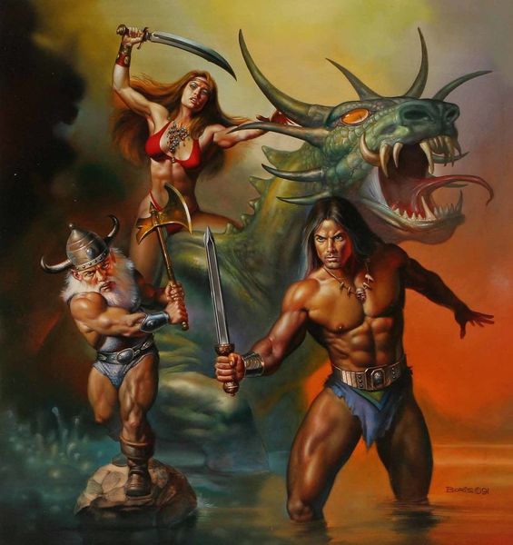 Editor: We're looking at Boris Vallejo's "Gilkarth's Odyssey" from 1997, painted using acrylics. It’s quite dramatic! I’m struck by the central figure's muscularity and dominance over the fantastical creatures. How do you interpret this work? Curator: From a formalist perspective, let’s consider the interplay of forms and color. Note the dynamism achieved through the spiral composition—the snake, the hero's stance, and the creatures all contribute to this upward thrust. And have you noticed how the artist uses contrasting warm and cool colors to delineate the central figure and the monsters? Editor: Yes, I see the contrast now! The figure really pops against that muted, almost lunar, background. Is that contrast intentional? Curator: Precisely. Vallejo employs it to emphasize the figure’s power, drawing the eye directly to the hero. Look at how light reflects off his skin, highlighting the definition of his muscles. This manipulation of light and shadow creates a sense of depth, rendering the figure almost three-dimensional. Notice also the texture achieved with the acrylics, especially in the rendering of the snake scales. It’s almost hyper-realistic in places. Editor: I didn't think of that, but it makes sense. Focusing on the visual elements really enhances how dramatic and even… theatrical the painting is. I learned that breaking it down visually shows intention and is not just pure spectacle. Curator: Indeed! Formal analysis allows us to move beyond mere appreciation and understand the artist’s techniques and the overall aesthetic effect of the composition.