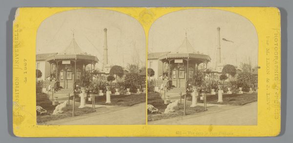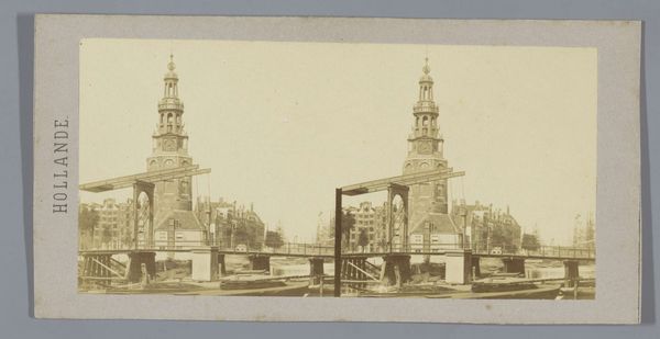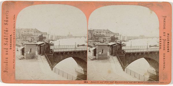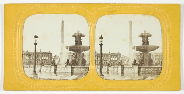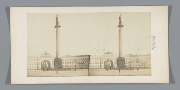 Curator: Looking at this photograph, titled "Trafalgar Square in Londen," taken between 1864 and 1879 by an anonymous artist, I'm struck by its composition. The stereoscopic format presents two slightly offset views, framed within a decorative border. Editor: It’s funny, isn't it? This makes London feel both intimate, almost like a memory viewed through a locket, and imposing with its architectural grandeur. It’s a place caught between the epic and the everyday, don’t you think? Curator: Indeed. The photographer has effectively captured the monumental scale of Trafalgar Square by using framing structures, like arches and the Nelson's Column, while balancing it with everyday life, suggesting the movement of the figures below. Observe the lines of perspective which draw the eye towards the background. Editor: What intrigues me is how the blur of motion makes everything feel ephemeral. Despite the rigid architectural forms, life just pulses. I like how the lack of sharp focus turns real people into ghosts. And this neutral sepia tint suggests the transience of existence. This tension makes the photograph so evocative, almost wistful, really. Curator: The materiality of photography in this period also contributes. The limited tonal range emphasizes texture and form, rather than accurate color rendition. Notice the play of light and shadow across the architectural details—the careful arrangement of the architectural masses and its structural components give coherence to this photographic endeavor. Editor: You know, if I didn't know this was London, it could be anywhere monumental and vaguely sad, yet humming with barely visible life. It could even be a dream, rendered in tones of caramel and faded ink. The city's essence becomes secondary. What is central, instead, is the human longing embedded within this old image. Curator: Precisely! A very illuminating insight. I hope our listeners found this close study of form and composition enlightening. Editor: As for me, I'm lost again in those swirling ghosts of London’s past… wishing I could shake hands with one and buy them a drink.