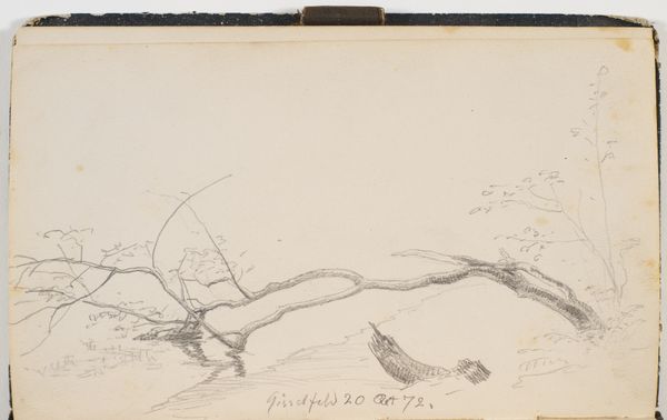 Curator: This drawing, made with pencil on paper, is entitled "Spinkle grene og løv," which translates to "Sprig Branches and Leaves," created by P.C. Skovgaard in 1872. It currently resides in the collection of the Statens Museum for Kunst. Editor: The immediate feeling is one of quiet observation. It feels intimate, like a stolen glance into nature’s notebook. I’m curious about the purpose it served to the artist. Was it preparation? A simple exercise? The sparcity contributes to an air of spontaneity. Curator: Considering the context of Skovgaard's larger body of work, dominated by landscape paintings, one could definitely interpret this work as a preparatory study, particularly as there is what looks like handwriting just beneath the rendering. It highlights his focus on rendering detail through drawing before the work of painting. Editor: It is interesting how even these minimalist lines carry the weight of the wider romantic movement. What meanings were the branches, leaves, the nature symbols of the day freighted with? Curator: Trees and foliage in art from this era often represent ideas of growth, renewal, and a connection to the divine or natural world, embodying the sublime power and beauty that was so embraced by artists and the population at the time. Consider that these sketches allowed Skovgaard to return to a scene multiple times, drawing multiple versions in varying degrees of realism before beginning any final renderings. Editor: It makes me wonder about the physical labor and environment that resulted in the drawing before us. How much time might Skovgaard spend outside to produce just one page such as this? What effect does the means of production have on the resulting drawing and therefore what significance should that labor or context give us? Curator: Those are good questions. It reminds us that even the most seemingly simple sketch is the product of artistic intention, labor, and a specific historical context—a set of elements all working in collaboration to create this understated but still resonant work. Editor: Absolutely. It speaks to both the tangible process and the underlying symbolism present even in the most seemingly simple representations.