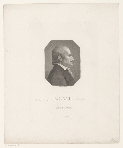 Editor: We’re looking at Anton Wachsmann’s "Portret van Edward Sir Codrington," dating roughly from 1818 to 1832. It's an engraving – rather stately. I find the man portrayed so…serious. Almost severe. What strikes you about this portrait? Curator: Ah, Codrington! Well, the interesting thing about portraits is, aren't they all a bit of performance? He probably held that gaze! Wachsmann’s clean lines really do capture the neo-classical spirit, which always feels like a self-conscious reach back to some imagined Roman ideal. Notice how sharp and economical his lines are. It’s all very… purposeful. Is it successful in its aims, though? That's always the question, isn't it? Do we believe in Codrington's gravity? Or do we think it's an act? Editor: That’s a great point – the ‘act’ of portraiture. It DOES feel a bit…forced. But how can you tell if it’s successful? What should I be looking for? Curator: Good question! Ask yourself, does the face offer a suggestion of interiority, or does it shut us out? For me, I get the sense that he is inviting us in, as a gentleman is prone to do. It's less about precise, objective "truth," and more about suggestion, evocation… a little whisper of the subject's perceived character. Do you get that whisper? Or does the subject tell a tale, maybe? Editor: I think…a whisper. It’s growing on me. Curator: There you go! Isn't that often how it happens? These artworks can be a bit like those people who you eventually warm up to after spending a significant amount of time with them! Editor: I agree! Thanks for making me reconsider my initial response – I definitely see it differently now.