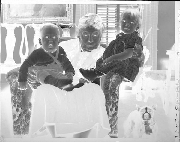 Editor: This photograph, by Lucian and Mary Brown, features two girls holding baby ducks. It's small, almost like a snapshot, but the inverted tones give it such a strange, haunting quality. What do you see in this piece? Curator: I see the vulnerability of childhood juxtaposed with the objectification of nature. The girls are positioned as caretakers, but their youth raises questions about their capacity to truly protect these animals. Consider the historical context: How might gender roles and societal expectations influence the relationship between young girls and animals? Editor: That's a really interesting perspective. I hadn't considered it in that light. It makes me wonder if there's a commentary on innocence and responsibility embedded in the image. Curator: Exactly. And the inversion of tones might symbolize a disruption of traditional power dynamics, inviting us to question our assumptions. What does it mean to see the familiar in an unfamiliar way? Editor: That's given me a lot to think about – the photograph is more complex than it initially seemed. Curator: Indeed, it's a powerful image that sparks critical dialogue.