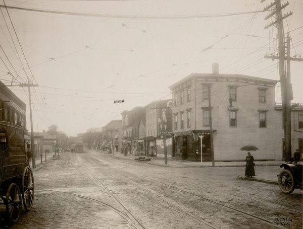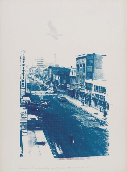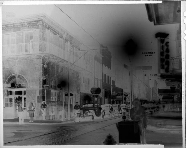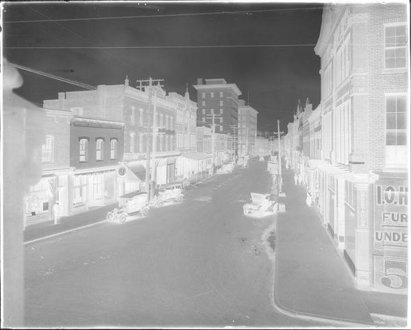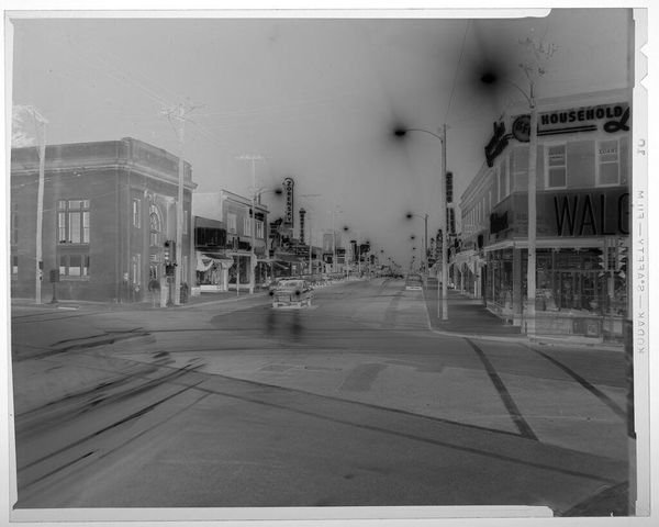 Editor: This photograph, "Untitled (city street at night)" by Jack Gould, really strikes me with its high contrast and eerie feeling. What stands out to you about this image? Curator: The material production is key here. Look at the photographic process. It's an inverted image; the darks are light and vice versa. This evokes the labor, the darkroom, the chemistry of image-making itself. How does that labor influence our understanding of the scene depicted? Editor: That's interesting. It makes me think about how the photograph isn't just a representation but also a constructed object. Curator: Exactly! The consumption of images like this also speaks volumes about mid-century urban life. We are witnessing a transformation in commerce through the lens.