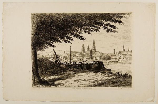 Curator: This is "The Queen's Promenade" by Maxime Lalanne, a work held here at the Harvard Art Museums. Editor: It's so delicate. The first thing I notice is the way the light seems to shimmer across the water, despite the limited palette. Curator: Yes, Lalanne's etching technique really captures that fleeting quality. The scene depicts a popular public space, a place for leisure and display. You see the figures strolling along the riverbank. Editor: It's interesting how public spaces become stages for social performance. The "promenade" itself suggests a ritual, a choreography of visibility and status. Does the Queen's title imbue the scene with a sense of authority? Curator: Perhaps, or maybe it democratizes it. This artwork gives us a glimpse into the social fabric of the time. Editor: Absolutely, and it reminds us that art can subtly encode the power dynamics of a particular era. Curator: Indeed. A fascinating little snapshot of a moment in time. Editor: Yes, leaving me pondering the echoes of social structures reflected in art.