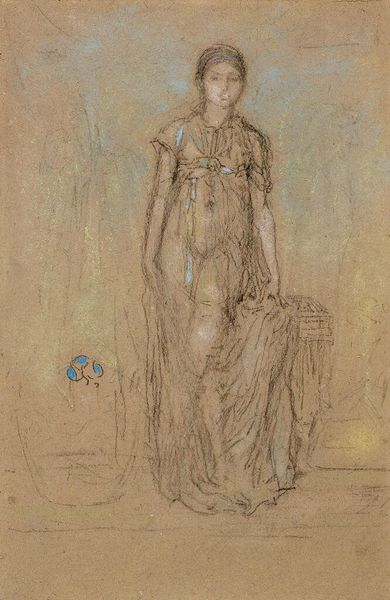 James McNeill Whistler crafted this pastel drawing, Annabel Lee, capturing a lone figure by the sea. Note the irises at the bottom, their delicate purple evoking Iris, the Greek goddess of the rainbow, a messenger between the heavens and earth. This motif of a lone figure by the sea appears throughout art history; consider Caspar David Friedrich's "Wanderer above the Sea of Fog." But here, instead of confronting the sublime, our figure seems lost in reverie, gazing towards the horizon. The sea, often a symbol of the subconscious, merges with the sky, blurring boundaries between reality and dreams. The loose, flowing drapery hints at a classical influence, reminiscent of ancient sculptures of nymphs or goddesses. Yet, it is the figure’s turned back, the averted gaze, that speaks volumes, suggesting a world of introspection and unspoken emotions. This pose taps into our collective memory of longing and contemplation, engaging us on a deeply personal level. It is a pose that has evolved through time yet continues to be imbued with a sense of mystery and melancholy.