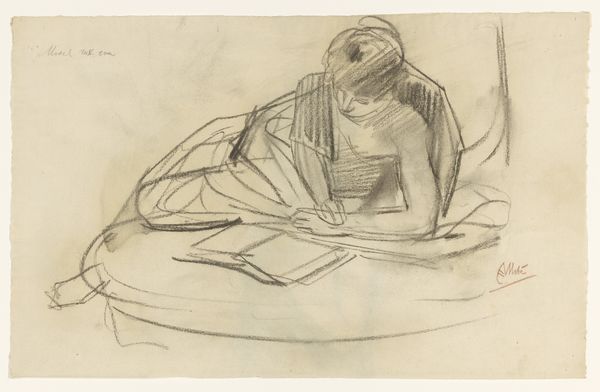 Curator: Here we have Pierre Bonnard's "Kvinde i badekar," created in 1942, held here at the Statens Museum for Kunst. The artwork utilizes watercolor, pencil, and lithographic techniques on paper, presenting us with a moment of intimate solitude. Editor: My first impression? This work feels like a fleeting memory, seen through a veil. The figure, the colors... everything appears soft, almost dissolving into the light. It has a certain melancholic beauty. Curator: Absolutely, that's part of Bonnard's magic! The hazy forms invite us into the sitter's private space, but keep us at a remove too, don't you think? There's this incredible play between visibility and abstraction. Notice how he uses the pencil and watercolor to create a vibrating, shimmering effect that almost dematerializes the form. Editor: The composition, too, seems to emphasize this. The crisscrossing lines in the background mimic the figure's enclosed position, enhancing that sense of interiority. The structural use of line seems to almost trap the figure, no? A subtle suggestion about the domestic sphere in wartime, perhaps? Curator: That's a fascinating reading, and knowing Bonnard's anxieties during World War II, it's definitely possible. The seemingly banal scene, a woman bathing, transforms into something far more profound, hinting at both confinement and contemplation amidst chaos. Editor: And it's the interplay between those mundane and monumental scales that I love, that almost inarticulate visual language, or the material fact of watercolour and lithography which combine in such an eloquent way. The artist makes it seem so intuitive and organic, such a deeply expressive and emotive statement through compositional and color arrangement, I am immediately transported into that place. Curator: A visual poem, in a way, wouldn't you say? I think we both agree, after all, that this artwork invites the viewer to delve into its layered meanings, and appreciate its quiet power. Editor: Precisely! A momentary glimpse becomes a sustained reflection. The artwork invites us to look deeper, to feel beyond the surface, I love that!