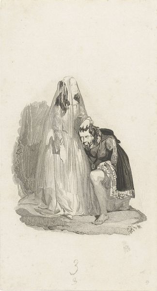 Curator: Well, that’s… charmingly grim. Makes you chuckle, doesn’t it? Editor: In its bleak way, yes. This is "Merci, ma vieille, trop décrépite!..." a lithograph dating from the 19th century by Honoré Daumier. Its visual elements suggest that its classification falls under romanticism, even as the figure’s caricatured style indicates something else. Curator: "Merci, ma vieille, trop décrépite!..." That translates to "Thanks, my dear, too decrepit!" Heavy stuff. And just LOOK at those figures—it’s like a bizarre, politically charged wedding gone wrong. Editor: Indeed. Focusing on composition, notice the stark contrast? Jacques Bonhomme—the everyman figure representing the French people—stands passively on the left. Meanwhile, on the right we have the grotesque caricature of Monarchy, decaying and voluminous. Curator: She’s draped in this…shroud-like dress? It gives off major ghostly bride vibes. Her hand reaching out as if pleading with Jacques Bonhomme? Classic toxic relationship. I see an element of historical painting. You? Editor: Agreed. Consider how Daumier renders the very *idea* of Monarchy; look at the textures of the aged, collapsing forms, how he uses line and shadow to show deterioration. The word “MONARCHIE” plastered across her dress? A brilliant, blunt metaphor. Curator: That "Monarchie" sash is pretty unsubtle, agreed. Like a neon sign that shrieks decline and doom. Poor old Jacques looks about as thrilled as you would to bump into your ex looking like that! Editor: It's the stoicism of Jacques Bonhomme that truly hits home for me. It reveals Daumier's commentary on France’s socio-political landscape. There's such resignation and almost dismissive acknowledgement. His facial features are both pitiable, and infuriating, in the way that they reveal him at the point of no return with Monarchy. Curator: You almost feel bad for "Monarchie." I am curious about its function as satire, as comedy is only tragedy plus time! But mostly I agree, it’s sad! This artwork serves as a rather striking, somewhat tragicomic snapshot of a relationship past its expiry date. A little scary, even. Editor: And within the formal austerity of the black and white lithograph a silent story unfolds, reflecting a historical unease and perhaps, something of a premonition about futures doomed to become history, like all futures eventually will.
