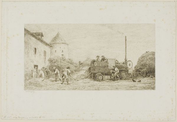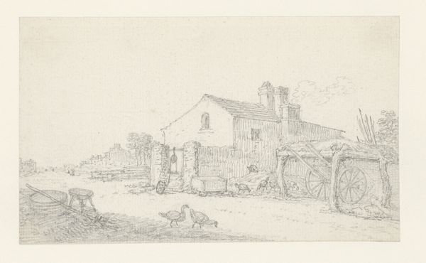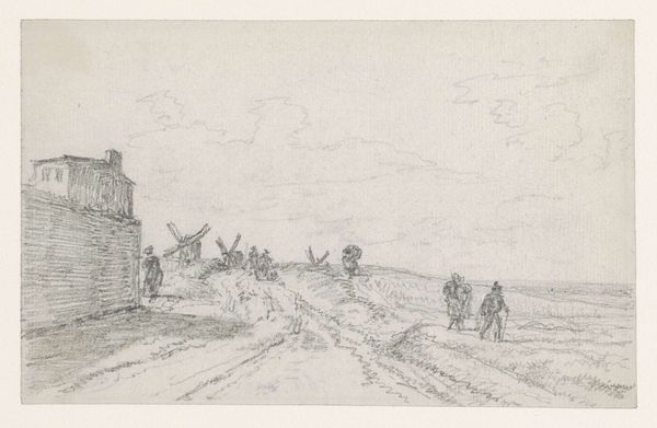 Georges Michel created this drawing, "Oplopende straat met huifkar," using graphite. The composition draws us into a street scene marked by receding lines and subtle tonal variations. The light, almost ethereal quality of the graphite lends the scene a dreamlike atmosphere. The artist plays with perspective, guiding our eye along the street towards a distant horizon. The buildings and figures are rendered with a delicate touch, their forms suggested rather than strictly defined. This evokes a sense of transience and the ephemeral nature of everyday life. Michel's focus on the interplay of light and shadow reveals his sensitivity to atmospheric conditions. Note how the subtle gradations of tone create depth and volume, giving the scene a palpable sense of space. This emphasis on formal elements reflects a broader artistic interest in capturing the fleeting effects of nature. It invites us to contemplate the poetics of the everyday.