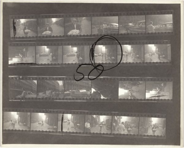 This is Robert Frank’s “11th Street story 48”, and it's a photographic contact sheet – a bunch of moments laid out for us. Frank’s known for capturing life as it happens, and that feels like a process right here on the surface. The images are raw, like sketches in a visual diary. You can see the grain of the film, the way the light and shadow play, and the little imperfections that make it so real. The contact sheet format reveals everything – the outtakes, the experiments. It’s like looking at the artist’s mind at work, making choices, editing, trying to find the heart of the story on 11th street. Think about someone like Garry Winogrand, another street photographer. Both share this way of framing a moment, catching life off guard, but in different ways. Frank’s work is always about life’s in-between moments. It's about letting the images speak, even if they don’t always have a clear answer.