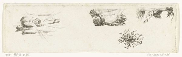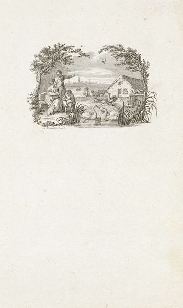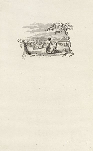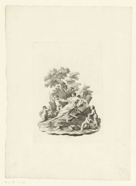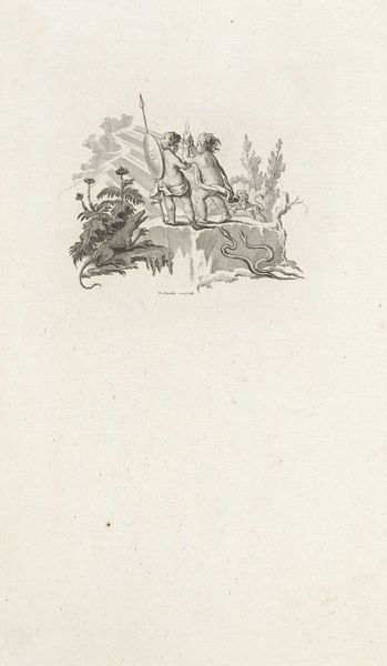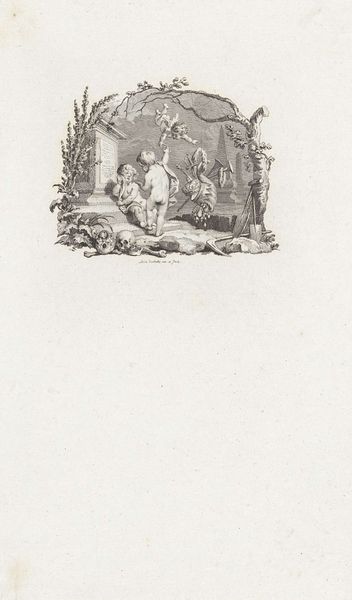Curator: This is Reinier Vinkeles' drawing, “Vignet met een putto die bij een graf in het bos wordt aangevallen door een slang,” dating from between 1751 and 1816. The work, rendered in ink, pencil, and paper, resides here at the Rijksmuseum. Editor: It immediately strikes me as melancholic. The monochrome palette reinforces the sombre scene. The vulnerability of the putto, juxtaposed with the looming serpent, suggests an allegory of lost innocence and looming mortality. Curator: Indeed. The visual structure, organized within an oval frame, emphasizes the thematic tension between life and death. The use of light and shadow defines the figures—the serpent and putto each receiving almost equal highlights. It is allegorical and exemplifies Romanticism. Editor: The creation of such intricate detail using relatively simple materials and tools underscores the artistry involved. Think of the labour required to bring forth the contrast of light and shadow. Curator: Structurally, the rising stairs lead toward the vanishing point under the moonlit sky—but simultaneously to the dark trees—adding a directional complexity. Editor: It's important to consider the socio-economic context. Paper in this era would be a precious commodity; we are witnessing both craft and capital merge here, with an overt expression of the mortality. Curator: And observe how Vinkeles carefully modulated the density of his lines to create gradations in tone, enriching the emotional tenor, reinforcing, visually, the transience of life through calculated artistic production. Editor: A fitting and poignant emblem to remind us of both the tangible nature of the work and its capacity to inspire contemplation about how our culture has constructed morality. Curator: It offers an interesting synthesis of form, content, and materiality in Romanticism. Editor: Precisely, it underscores the interweaving of labor and emotion, all visualized on a fragile and costly material. A testament to the transience and worth of mortal experiences, indeed.
