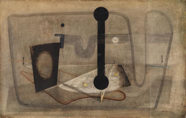 Curator: I find this "Untitled" drawing by Mark Rothko from around 1944 quite intriguing. It’s rendered in watercolor and colored pencil. What catches your eye first? Editor: Immediately, a feeling of searching. Like peering through a misty window, the shapes are present but not fully defined, existing in this murky grey space. Is that intentional or something circumstantial about his early abstraction? Curator: He's in that pivotal moment, right? Shedding figuration but not quite into those monumental color fields he’s known for. There’s a vulnerability here, searching for a visual language to express interiority perhaps during tumultuous times—World War II raging. Editor: Absolutely. The geometric forms layered with organic shapes – the ovals, the vertical lines. It is an echo of biological diagrams, an allusion to growth, held captive. And what's striking to me is the red slash, bisecting that teardrop shape – is it a wound? Curator: Or a barrier? I see it almost like a surreal keyhole—we are not allowed to cross the line. Rothko’s compositions at this time feel so deeply rooted in surrealism, dreams, primordial landscapes—it almost transcends literal interpretation and delves into the subconscious. The limited palette almost enhances that. Editor: I agree. Also, notice the dominance of that grayish color: its muted tone emphasizes a kind of veiled existence, almost a limbo-like state, while still alive. Do you agree the circles on the left have the impression of surveillance, looking in a fishbowl? Curator: In my mind, each shape possesses its own strange agency and there’s a quiet discourse, like figures frozen mid-conversation. In my read, Rothko wants to explore relationships but leaves a generous amount of interpretation to the audience. And sometimes what you feel is what matters most, beyond specific interpretations. Editor: This piece truly highlights that art-making as both a means for inner examination, and a reflection of outer socio-political conditions – perhaps all the more resonant today, and invites us to sit with unresolved feelings of uncertainty and seeking, which can still be powerful. Curator: Ultimately, "Untitled" embodies that potent transitional phase in an artist's career, and serves as a mirror reflecting human struggle between finding your way forward in times of disquiet.