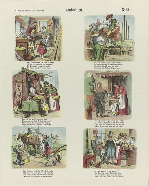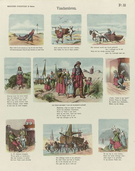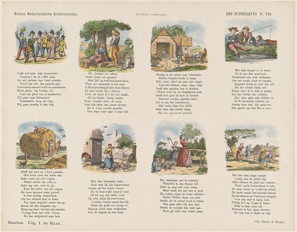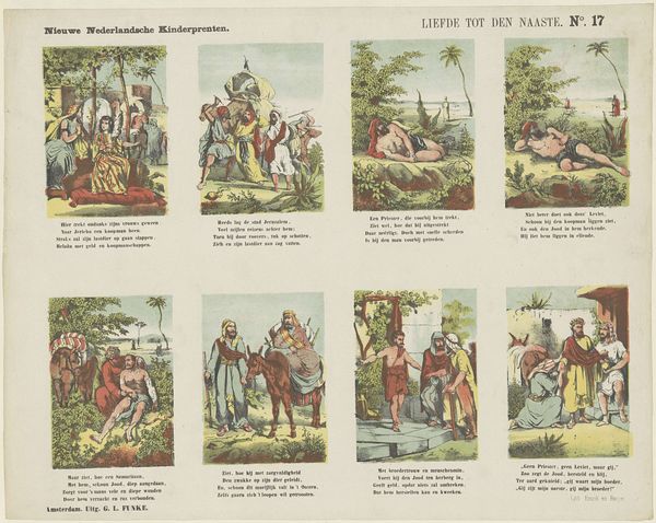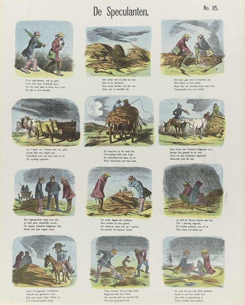 De belegerde stad, or The Besieged City, a print by De Ruyter & Meijer, presents us with a tableau of vignettes in a grid. Each scene, rendered with simple lines and flat color, captures a moment within a broader narrative, evoking the feeling of a medieval drama. The artwork's structure, resembling a page from a storybook, employs a layout that prompts our eye to move sequentially, like reading text. This arrangement guides us through a series of symbolic representations. The use of cartoonish figures and exaggerated expressions destabilizes any singular interpretation, inviting multiple readings of power, vulnerability, and resistance. Each scene serves as a sign, contributing to a semiotic system that reflects the anxieties and ethos of its time. The overall design functions as a cultural artifact that challenges fixed narratives, offering a space for ongoing interpretation and discourse about the dynamics of conflict and society.