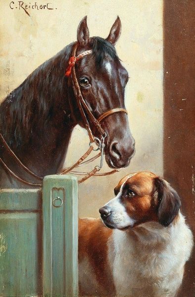 Carl Reichert painted "Besuch im Pferdestall", or "Visit to the stable" some time before 1918, and it explores the social dynamics between animals. Reichert, an Austrian known for his detailed animal portraits, likely intended to capture a peaceful, bucolic scene reflective of the era's romanticism. Yet, by focusing on the interaction between a horse and two dogs, the artwork subtly explores themes of hierarchy and companionship. The horse, towering over the dogs, is framed as the dominant figure, a symbol of status and power within the barn. The dogs, gazing upwards, reflect both curiosity and a sense of deference. Are they pets, working animals, or something else entirely? The painting invites us to consider the emotional lives of animals and their complex relationships with each other. While seemingly simple, Reichert’s work touches on deeper questions of respect, recognition, and the varied roles animals play in our world.