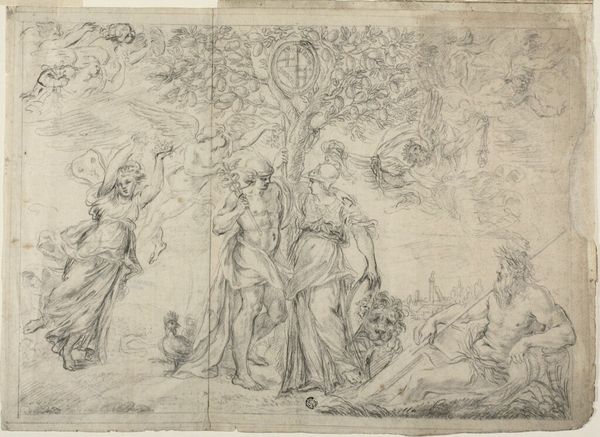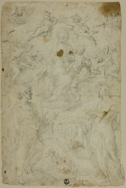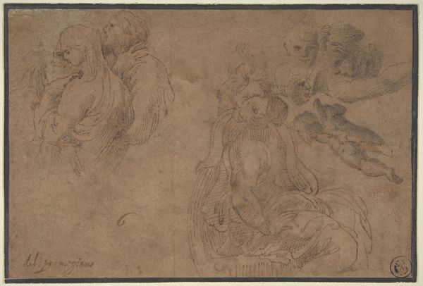 Curator: I'm struck by the intimate quality of this sketch; it feels like we're intruding on a private moment of artistic exploration. Editor: Indeed. Here we have "Motieven", an Italian Renaissance drawing from the 16th century, currently held at the Rijksmuseum. Crafted using pencil and potentially watercolor on paper, its creator remains anonymous, leaving us to decipher its meaning through the language of its time. Curator: My initial reaction is one of serenity, almost a quiet reverence. Despite the somewhat unfinished nature, the figures evoke a sense of grace and power, particularly in the depiction of the seated male figure. The composition on the right seems almost to convey chaos even as they embody grace. Editor: Absolutely. Notice how the figures and motifs presented connect to earlier iconic examples that established classical cultural memory. Take, for example, the prominence of mythological allusions represented in the male figure or even the Madonna and Child towards the bottom right corner which directly borrows from prominent Renaissance art's fixation on biblical depictions that center on humanism. How do these visual devices build a case for the period’s obsession with reclaiming classical ideals? Curator: It’s fascinating how the artist has rendered these archetypes not as static symbols, but as living forms caught in fleeting moments. The loose pencil strokes convey a sense of dynamism, while the delicate shading gives them depth and dimension. What does the social landscape of the time tell us? Editor: During this era, depictions of male forms in artistic settings like this drawing served as instruments in promoting not only the male figure, but the concept of Western cultural and societal superiority. In an artistic field dominated by men, there are social factors present here. This artwork reflects the Renaissance-era conventions and politics by the power structure that privileges that dominance. The emphasis of such social politics becomes an argument within society itself on social issues in play here. Curator: It certainly provokes thoughts about the relationship between art and social status. The Renaissance truly reveled in visually and metaphorically recreating cultural tropes, didn't it? It reminds me of that period's overall artistic project: an elaborate and often contradictory effort of meaning-making and re-presentation of culture. Editor: This sketch provides an enriching example of how those themes worked with cultural conventions during that era, making it quite thought-provoking. Curator: It’s given me new angles on both this piece and its place in the wider context.