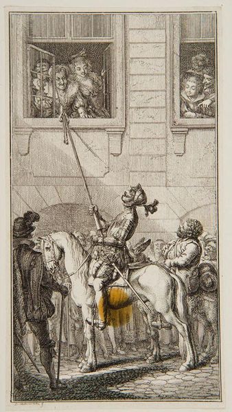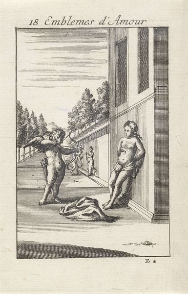Curator: Daniel Berger, who lived from 1744 to 1824, created this small engraving, "Illustration to Tristram Shandy, p. 41," and it's currently held at the Harvard Art Museums. Editor: I find this image quite whimsical! The exaggerated features, particularly that long nose, and the awkward postures give it a rather satirical air. Curator: It does capture the spirit of Laurence Sterne's novel, Tristram Shandy, which was known for its digressions and eccentric characters. The book itself was pushing against many literary conventions. Editor: Absolutely. And Berger’s image pushes against artistic conventions as well. It seems to be questioning authority, masculinity, and perhaps the very idea of heroism. Curator: Consider the socio-political context in which Sterne was writing. What Berger does is translate that critique into visual form. It’s interesting how art can reflect and amplify existing social dialogues. Editor: I agree. This is a moment where we can really appreciate the power of art to engage with, and even challenge, the status quo. It's a reminder that art is never created in a vacuum.