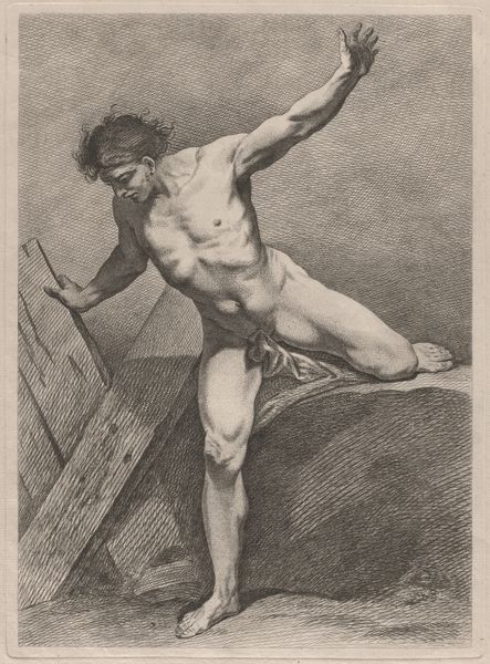 Pièrre Recco captured this nude male figure in a drawing. The pose—a figure seated with one arm raised and the head bowed—echoes a profound sense of melancholic reflection, a theme deeply embedded in our cultural memory. Consider, for instance, the classical depictions of mourning figures. This gesture of a lowered head, combined with the extended arm, can be traced back to ancient representations of grief and contemplation. Think of the grieving figures on sarcophagi or the pensive philosophers in Roman frescoes. The melancholic mood resonates with the weight of human existence, a theme that resurfaces through history. This emotional pose invites us to connect with the artwork on a subconscious level, tapping into shared human experiences of sorrow and introspection, evolving and adapting as it resurfaces across time.