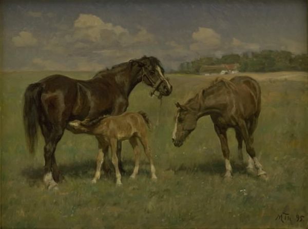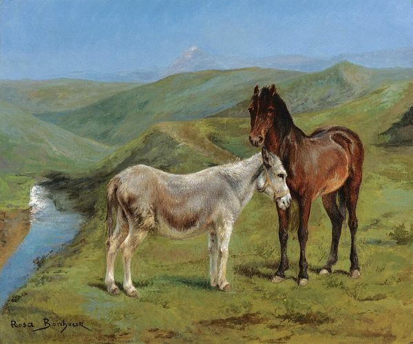 Rosa Bonheur's "Grazing Horses" is an oil painting, expertly crafted with brushes and a keen eye for detail. The material qualities of oil paint – its capacity for smooth blending and layering – are vital to the image. Bonheur captures the texture and weight of the horses' coats and muscles, creating a palpable sense of their physical presence. The artist's technique, rooted in academic tradition, also reflects her deep engagement with the natural world and the rural economy. These are not merely pretty animals. They are working animals. As such, they are tied to the 19th-century context of agriculture and labor, themes often overlooked in favor of purely aesthetic appreciation. Bonheur's attention to detail transforms what might have been a simple pastoral scene into a subtle commentary on the relationship between humans, animals, and the land. This painting reveals that even the most traditional of materials, when handled with skill and insight, can speak volumes about the social and cultural landscape of their time.