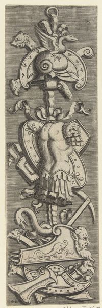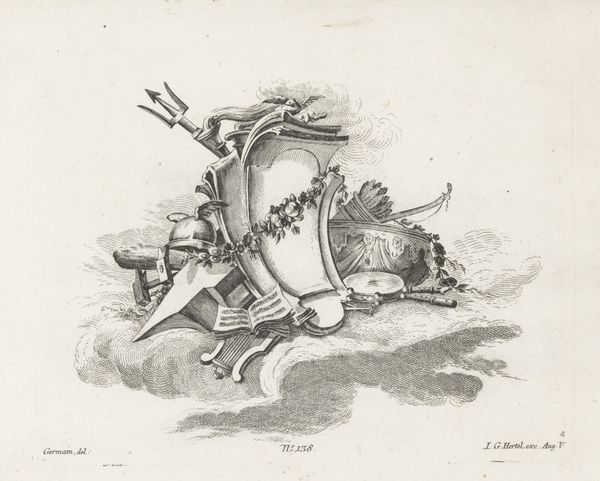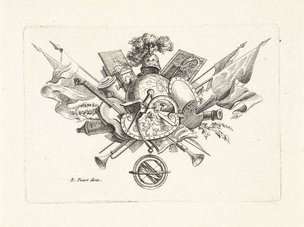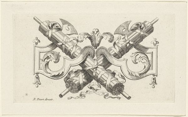 This vignette with masks and musical instruments was created by Bernard Picart using etching techniques, now residing in the Rijksmuseum. The composition, a dense array of objects, immediately strikes us. Two theatrical masks—one of comedy and one of tragedy—sit amidst an assortment of musical instruments. Above, a draped ribbon binds the ensemble. The etching technique renders fine lines, creating a sense of texture and depth, and the monochromatic palette focuses our attention on the forms themselves. This construction allows us to think about the relationship between performance, emotion and representation. The masks, classic symbols of theater, suggest roles and identities, while the musical instruments imply harmony and discord. Picart's arrangement of these elements invites us to consider how we perform, and how we present ourselves through cultural signs. It also challenges us to confront the interplay between the controlled, artistic creation and the chaotic, raw emotion it seeks to capture. The vignette operates not merely as a decorative piece, but also as an invitation to examine the structures underlying human expression.