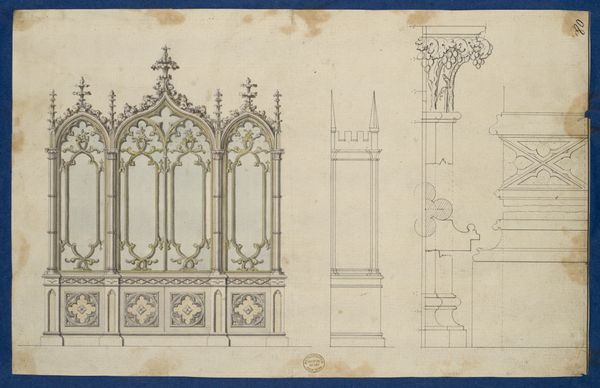 Curator: Looking at this piece, the first word that comes to mind is "stately". The crisp lines and symmetry really convey a sense of permanence. Editor: Precisely. This is "Iron Fence and Gate", created around 1936, likely a blueprint or design study rendered in metal and drawing. It shows not only the fence but offers crucial dimensions. Curator: Interesting that we're seeing the bare bones of the construction here. This really shows the means through which this project took shape—the transition of something from a design on paper into material reality is quite visible. Editor: It certainly brings attention to the intersection of craft and the industrial age. Ornamental ironwork experienced a revival in the early 20th century. Think about who could afford such custom fabrication during the Depression era; who commissioned it and where such gates were usually located says something important. Curator: Right, it is worth contemplating that interplay between luxury and security, access and restriction. I would want to examine the cost of iron at that time, the workshops that undertook commissions of this kind. The materiality itself carries weight here. Editor: These types of projects played a key role for architects and builders in marketing new architectural styles to potential wealthy clients. It also speaks to the cultural aspirations present in many cityscapes of that period. How the urban landscape presents itself becomes important. Curator: So, you're placing the work within a matrix of production and civic identity. Editor: Exactly! That history provides such a valuable lens. And to really think about it, this gate’s purpose shifts, and now the gates become images circulating in museums. Curator: So, both as objects of industry and indicators of historical taste, these iron gates provide us entry points. Editor: Yes, this provides an understanding of a complex historical moment. Curator: A potent testament to the way materials communicate ambition, labor, and cultural history!