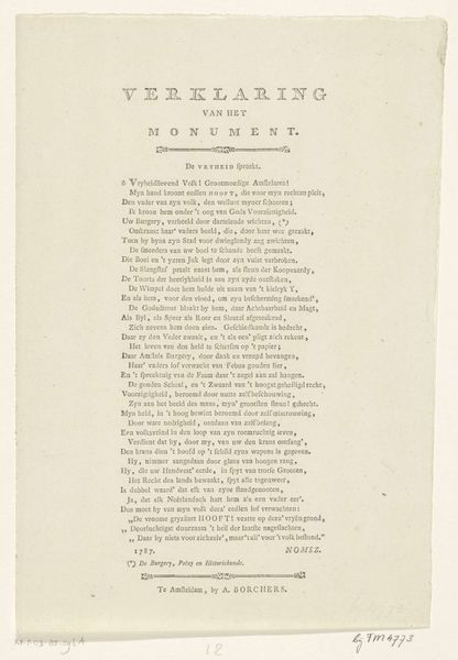 This is “Verklaring van de prent met het Monument voor Hendrik Danielsz. Hooft,” made in 1787 by Joannes Nomsz. The artwork is a broadside printed on paper, a public declaration of sentiments memorializing Hendrik Danielsz. Hooft. Broadsides like these were crucial in shaping public opinion and rallying support for political causes during the late 18th century in the Netherlands. They capture a society in transition, grappling with ideas of national identity and civic virtue. The text praises Hooft's virtues and contributions. The poem reflects the values of the Dutch Enlightenment, emphasizing reason, virtue, and public service. Hooft is celebrated as a symbol of these ideals. The choice of language and the act of public memorializing served to construct and reinforce a particular version of Dutch identity. This print participates in a larger cultural and political project: shaping collective memory and promoting civic values during a period of significant social change. It speaks to the emotional investment people had in their leaders and in the ideals they represented.
