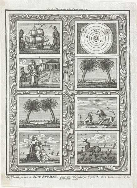 Editor: This is "Meiboom geplant door de Haagse Schutterij, 1764," a print by Caspar Jacobsz. Philips from 1764, and it's housed here at the Rijksmuseum. It gives off this ordered, almost encyclopedic vibe because of the frame and small scenes. What do you make of it? Curator: Well, first, what a fascinating relic of a bygone era. Look closer: Eight scenes nestled like gems within that decorative border. It speaks to me of the era's fascination with civic duty and classical allegory all at once. Editor: Civic duty, you say? Curator: Absolutely. Think of the planting of a May tree – it wasn't merely a horticultural endeavor, was it? Rather it was laden with symbolism—fertility, renewal, community pride, things to think about with our climate changing! Editor: True. And each individual scene...it’s almost like a story unfolding in separate panels. Is there a kind of narrative to these prints? Curator: It's definitely less linear and more...evocative. It invites the viewer to make connections. Which I think is a very active thing for art to ask. So in scene one for instance, the figures performing libations, seems to celebrate civic life with a touch of classical grandness, and later, it resolves to the rural and the every day. The planting is like…a sacred oath fulfilled. It even looks almost Masonic with all the architectural detail, almost scientific in some ways. And it just has that Old Dutch confidence too it doesn't it. Editor: I see! So it’s less about a sequential story and more about reinforcing this idea of community flourishing, historically, even. So much of the art here touches on everyday life and culture, I find that incredibly accessible. Curator: It shows us a thread linking the present with the past. Isn't it remarkable how much stories and ideas still find ways to connect us across all these generations?