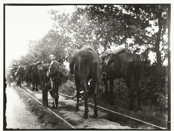 Editor: This gelatin silver print from 1897, titled 'Uniformed Man Holding Horse by the Reins on a Forest Path, Possibly near Pontoise' by Delizy, has this quiet, almost melancholy feel to it, don't you think? The muted tones give it such a stillness. What's your interpretation of the scene? Curator: You've hit on something important, that quiet mood. It reminds me a little of a memory, a half-remembered dream almost. It whispers of a time when photography was finding its footing, trying to capture something of the painted world. I wonder what the story is behind the man with his horse. Perhaps a moment stolen from military duties, finding solace in nature? Notice how the road bisects the image – a crossroads, literally and metaphorically. Editor: A crossroads... That's an interesting way to put it. Is the camera in his hand meant to symbolize something? Curator: Perhaps his interest in photography led to new understandings of the land around him. Or it could simply be that his camera served to document that space – even as it transformed through urbanization. Photography's truth feels poignant with passing years and landscape transformation. But tell me, what do you see when you consider the composition as a whole? Editor: I guess I never thought of photography having truth beyond what's being displayed... Now, I keep wondering what else is happening outside of frame that explains what the moment felt like. Curator: Exactly. Editor: I see a sense of transition - this solitary figure with his horse on a dirt road with a foot in an urban and rural landscape. Thanks so much for offering your thoughts. Curator: My pleasure entirely. This dialogue reminds me to consider all perspectives within single works.